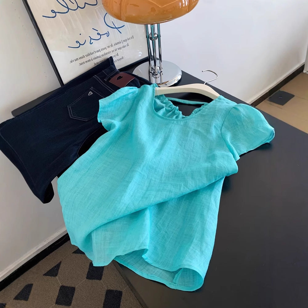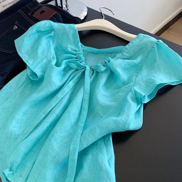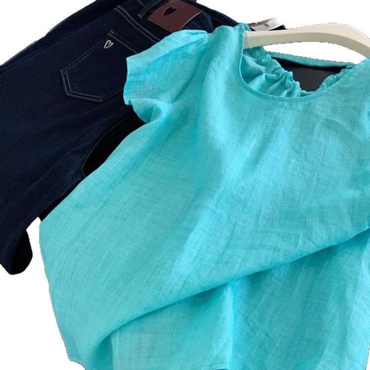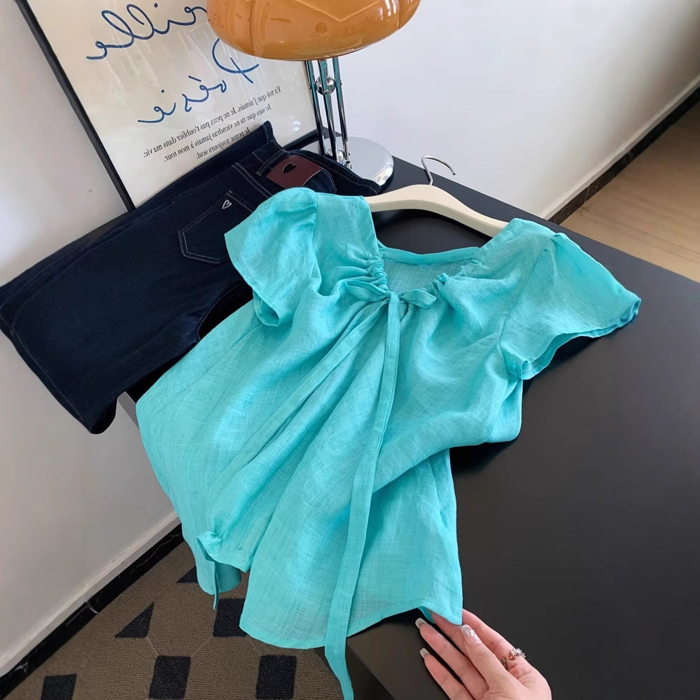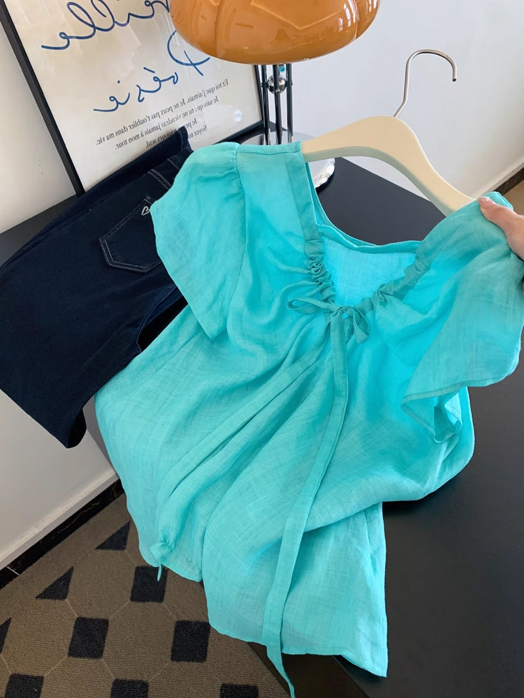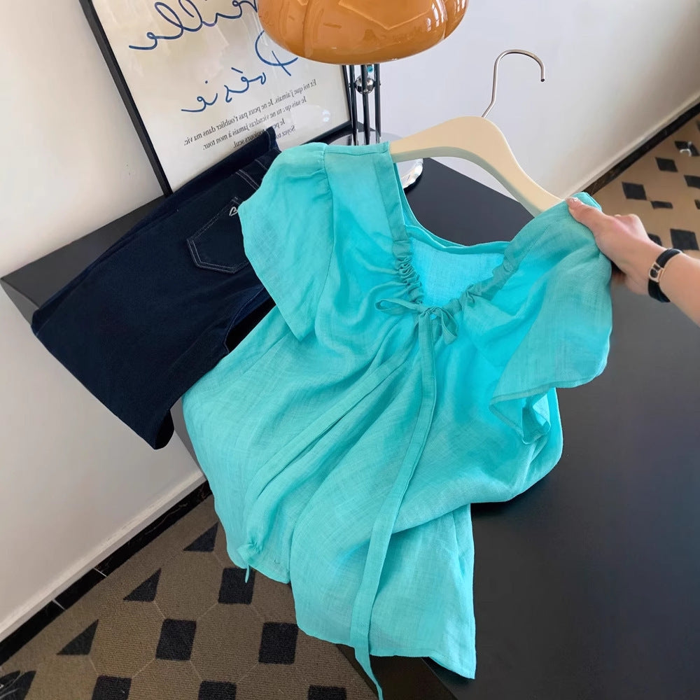 Ramie Blue V-neck Shoulder Short-sleeved Shirt Women's Unique Beautiful Top Light Luxury High-end