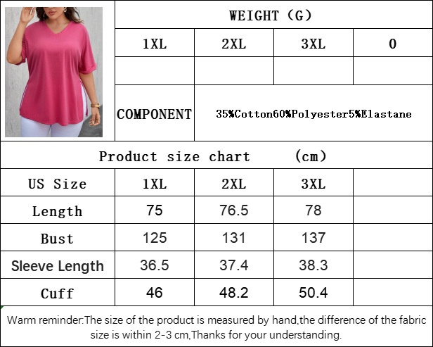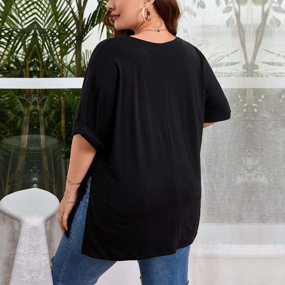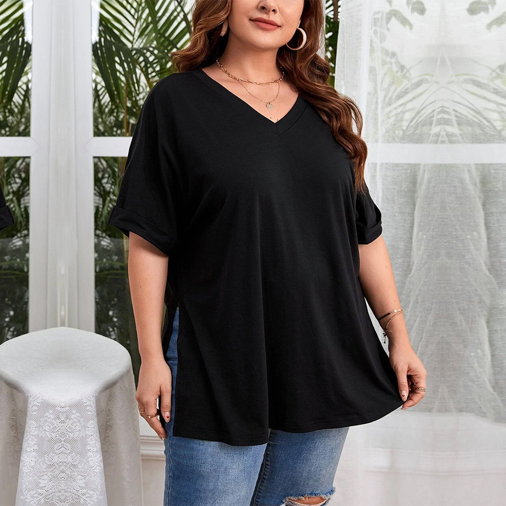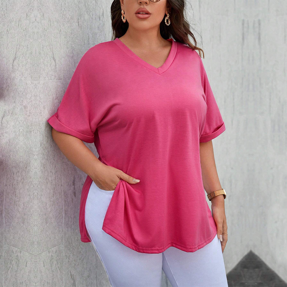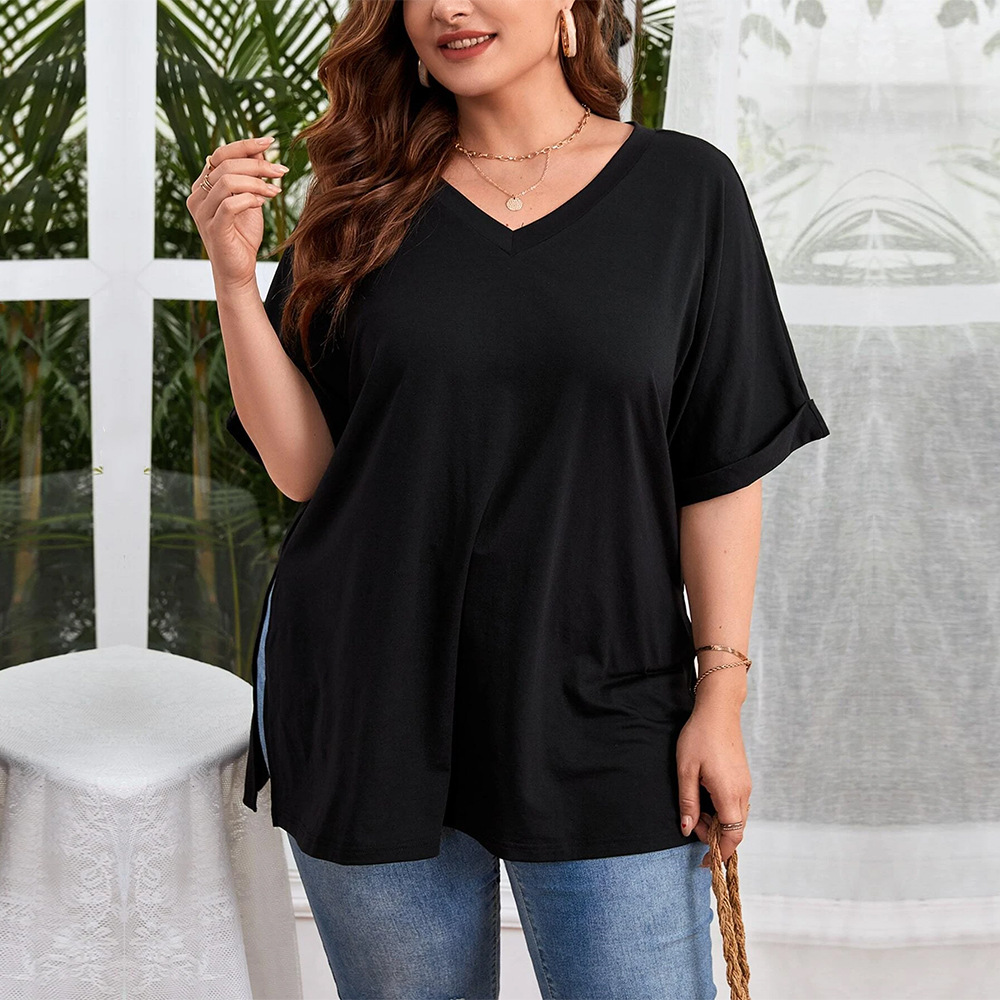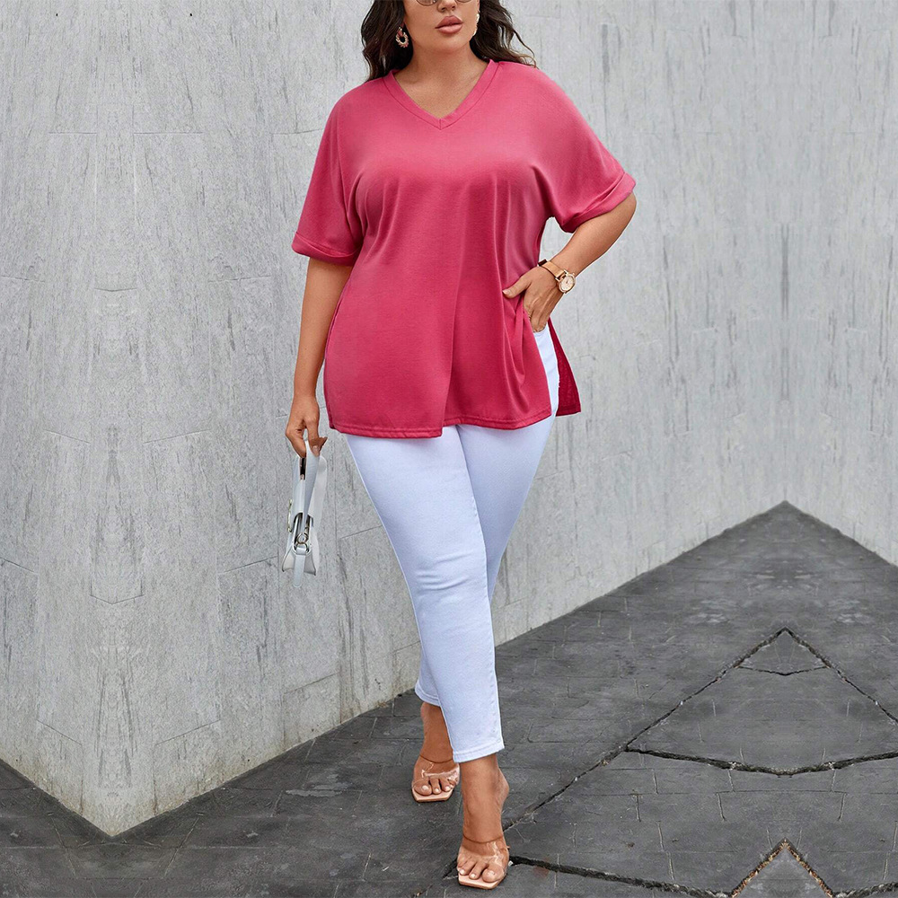 Women's V-neck Loose Casual Slit Solid Color Short Sleeve T-shirt Top